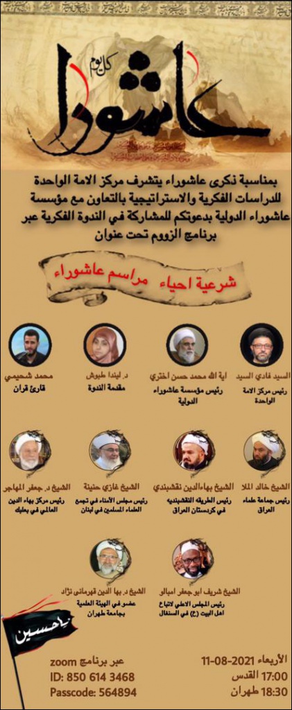 نشست «مشروعیت احیای مراسم عاشورا» با مشارکت آیت الله «محمد حسن اختری» مدیرعامل بنیاد عاشورا، «سید فادی السید» رئیس مرکز امت واحده، «شیخ بهاء الدین نقشبندی» رئیس طریقت نقشبندیه در کردستان عراق، شیخ «خالد الملا» رئیس جماعت علمای عراق، شیخ «غازی حنینه» رئیس هیأت امنای تجمع علمای مسلمین لبنان، شیخ دکتر «جعفر المهاجر» رئیس مرکز بهاء الدین العالمی فی بعلبک، شیخ «شریف ابو جعفر امبالو» رئیس مجلس اعلی اتباع اهل بیت(ع) در سنگال و شیخ دکتر «بهاء الدین قهرمانی نژاد» عضو هیأت علمی دانشگاه تهران برگزار می شود.