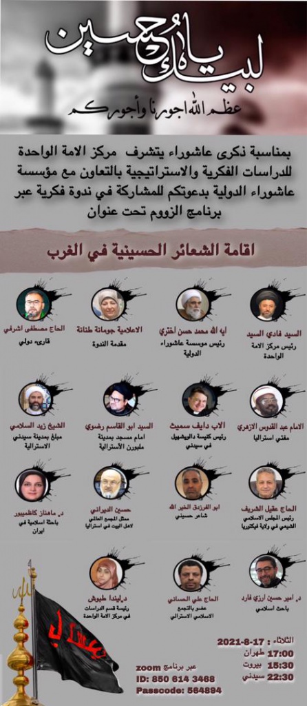 بنياد بين المللی عاشورا با همکاری نمایندگی مجمع جهانی اهل بیت(ع) در استرالیا و مرکز امت واحده وبينار مجازی بین المللی با عنوان "مراسم عزاداری امام حسین علیه السلام در غرب" را امشب 26 مرداد مصادف با ۸ محرم ساعت 17 با حضور علماء و شخصیت های فرهنگی و اجتماعی از سراسر جهان برگزار می کند.